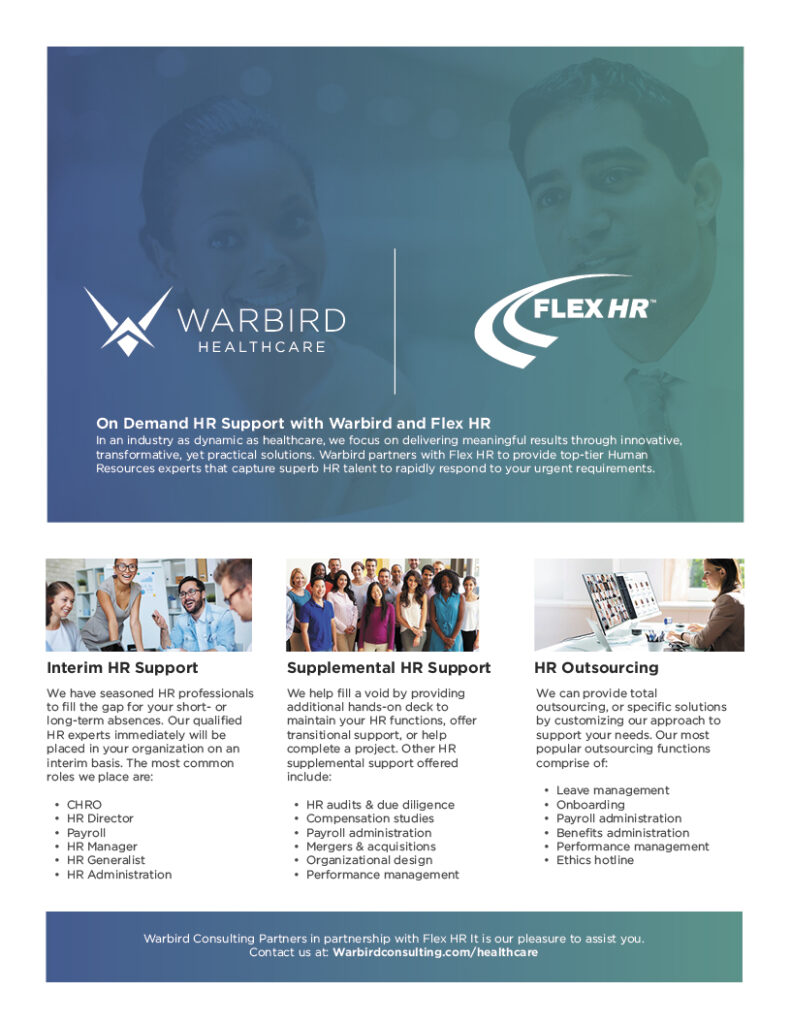 One example of our partnership success is how Flex HR and Warbird Healthcare have joined forces. Warbird is a financial and operational solutions firm of experienced practitioner consultants and advisors. As we all know, the healthcare industry is extremely dynamic, which is why Warbird affiliated with us here at Flex HR to better deliver exceptional Human Resources to businesses that need it. Warbird has seen a major increase in the need for immediate HR talent. Thus, Flex HR steps in to help fulfill these crucial demands providing interim HR support, supplemental HR support and HR outsourcing services.